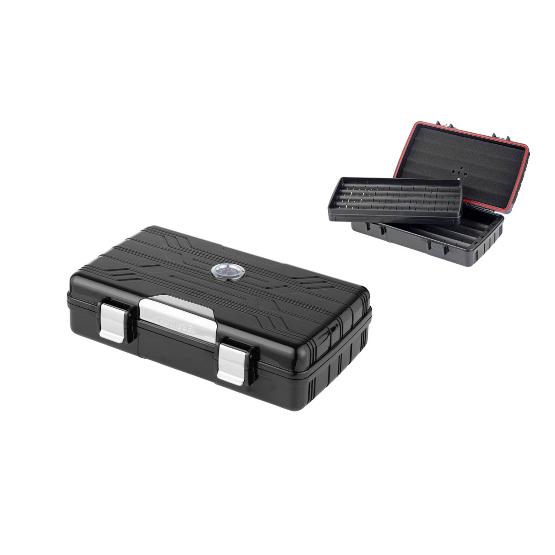 Χωράει περίπου 10 πούρα σε μαύρο πλαστικό και στο εσωτερικό έχει βάση αφρού. Διαθέτει αεροστεγές κλείσιμο και υγρόμετρο στο εξωτερικό μέρος και δύο αφαιρούμενους υγραντήρες.