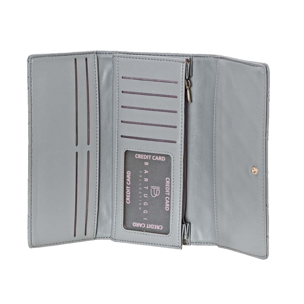 Γυναικείο δερμάτινο πορτοφόλι της BARTUGGI καπιτονέ με καπάκι και ιδανική διαρρύθμιση. Διαθέτει 9 θέσεις για πιστωτικές κάρτες, 2 θέσεις για χαρτονομίσματα, 2 επιπλέον εσωτερικές θήκες για ταυτότητα, δίπλωμα, κλπ, καθώς και εσωτερική τσέπη με φερμουάρ για τα κέρματα.