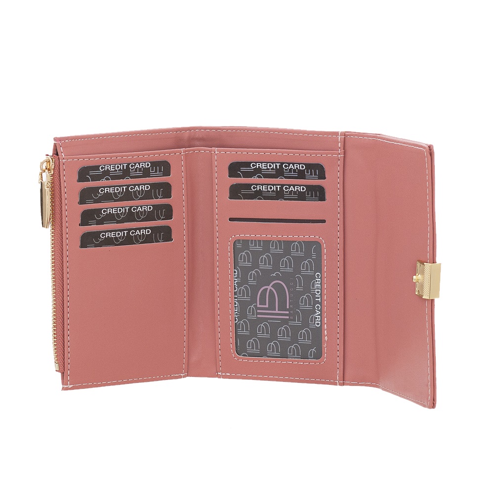 Γυναικείο πορτοφόλι της BARTUGGI κατασκευασμένο από δερματίνη, με καπάκι διακοσμημένο με μεταλλικό τετράγωνο στο κλείσιμο. Διαθέτει θήκη για κέρματα που κλείνει με φερμουάρ, θήκη για χαρτονομίσματα, 7 υποδοχές για κάρτες, και 2 επιπλέον θήκες για ταυτότητα, διπλώματα κ.ά.