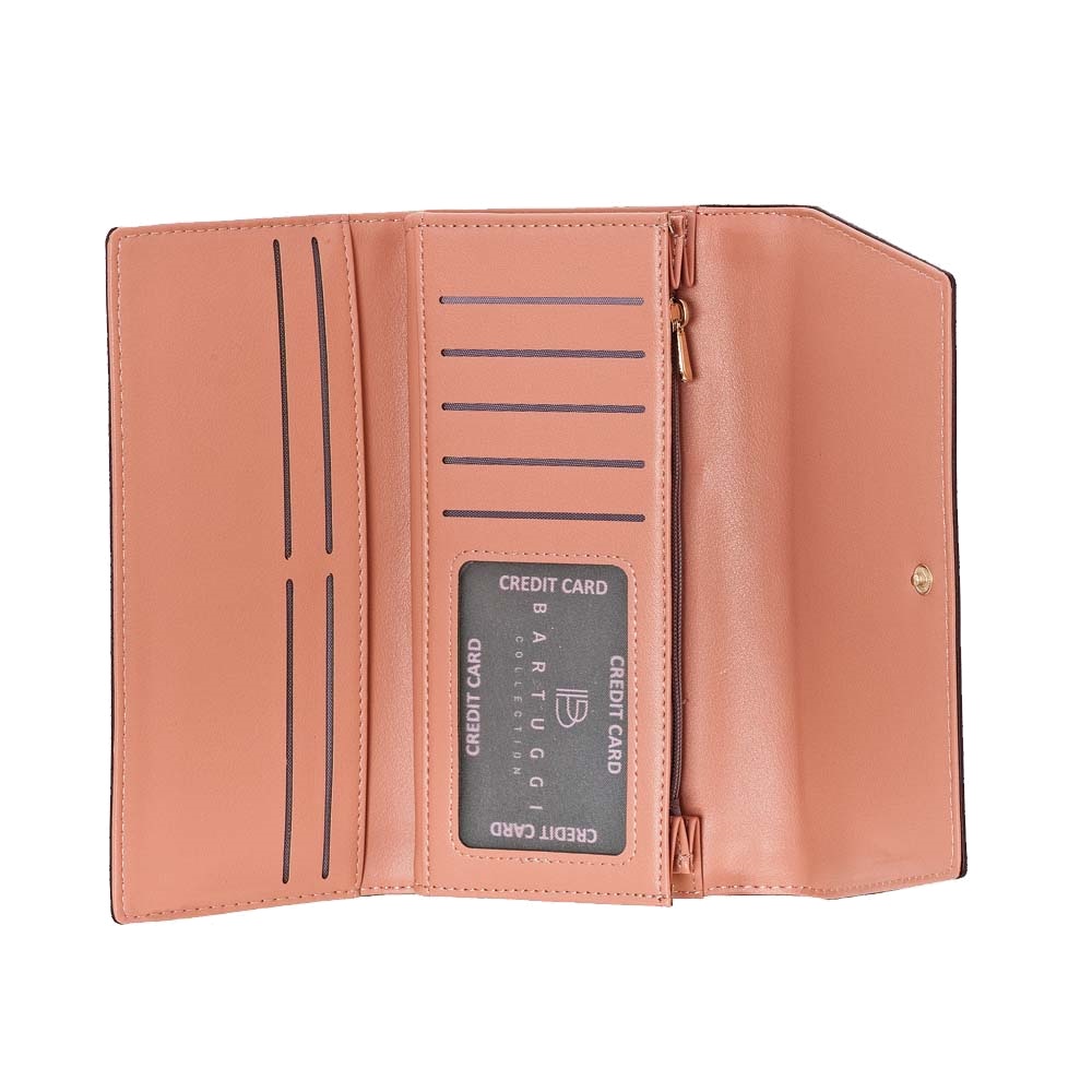 Γυναικείο πορτοφόλι της BARTUGGI με καπάκι και ιδανική διαρρύθμιση. Διαθέτει 9 θέσεις για πιστωτικές κάρτες, 2 θέσεις για χαρτονομίσματα, 1 επιπλέον εσωτερική θήκη για ταυτότητα, δίπλωμα, κλπ, καθώς και εσωτερική τσέπη με φερμουάρ για τα κέρματα.