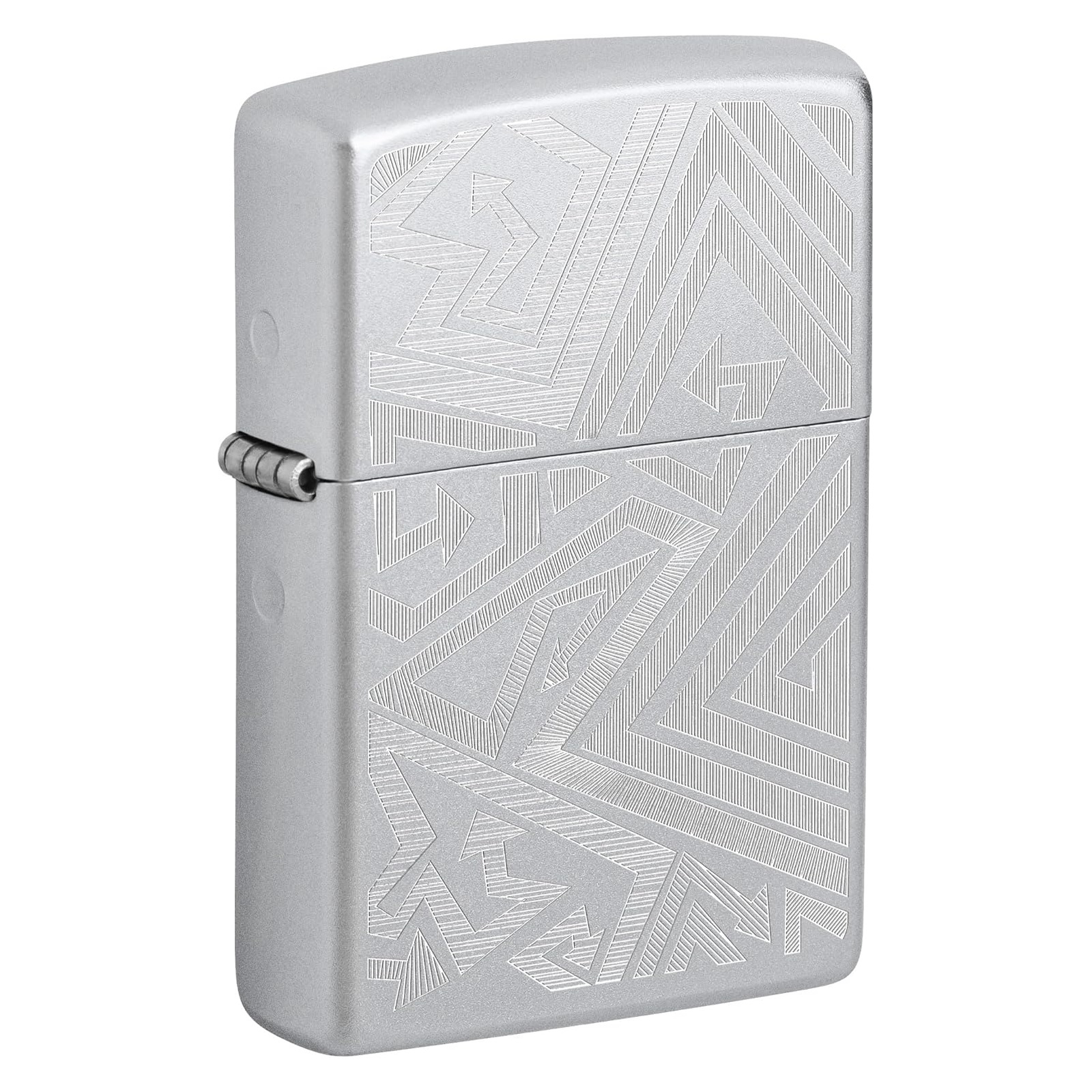 Αναπτήρας Zippo με σατινέ χρώμιο μέταλλο, χάραξη στο μπροστινό μέρος που απεικονίζει βέλη που κατευθύνονται προς διαφορετικές κατευθύνσεις.